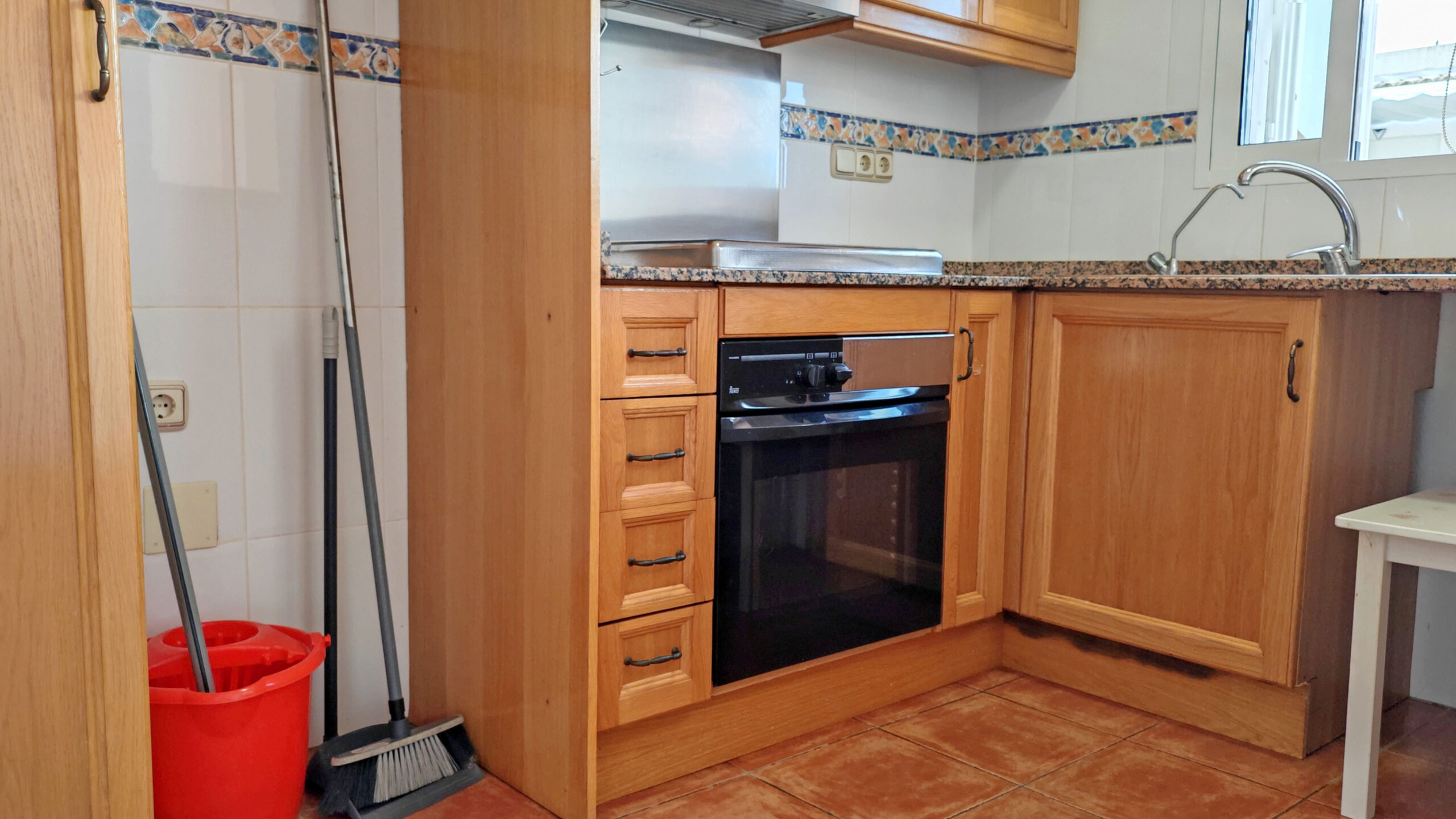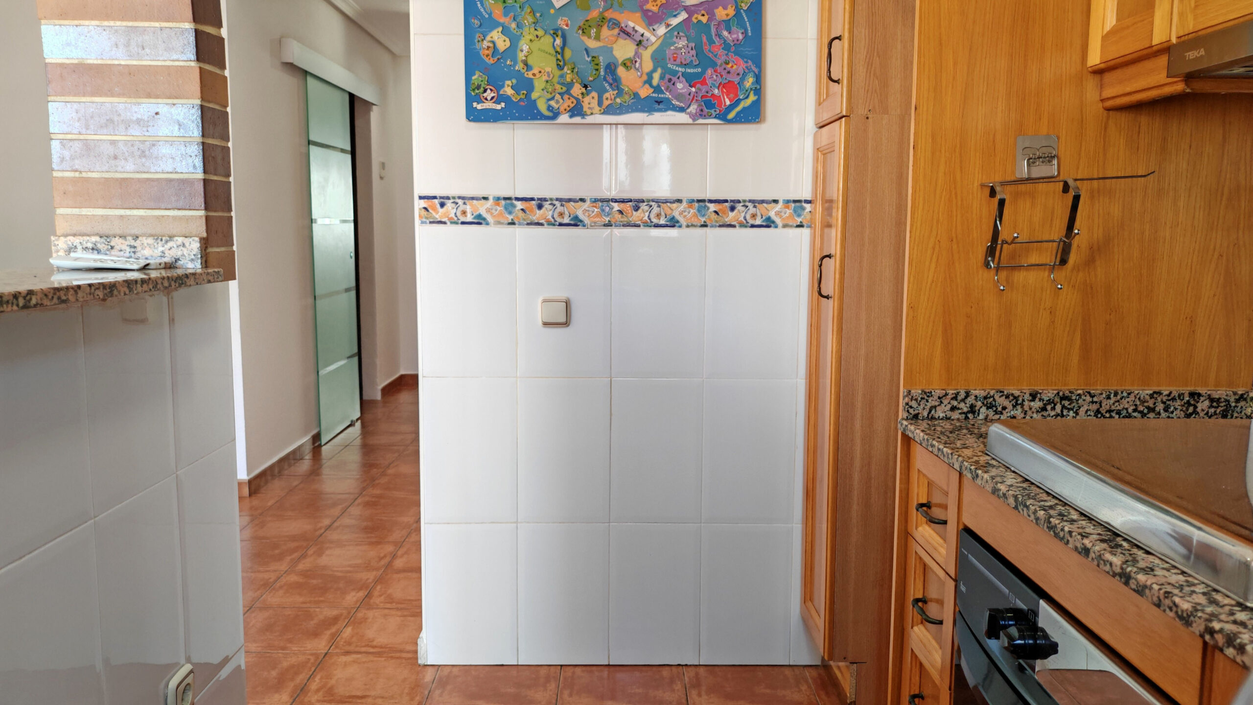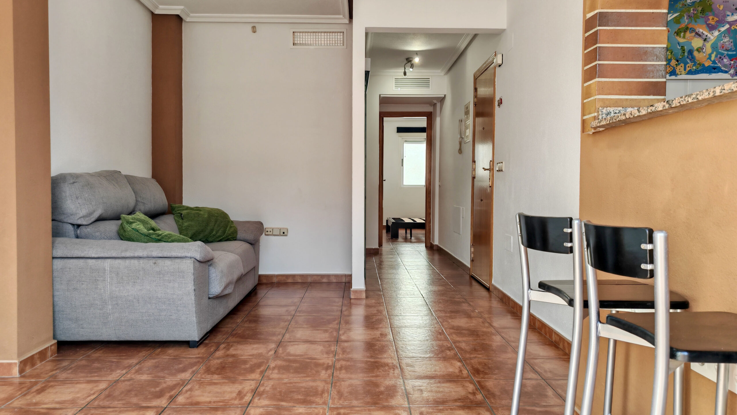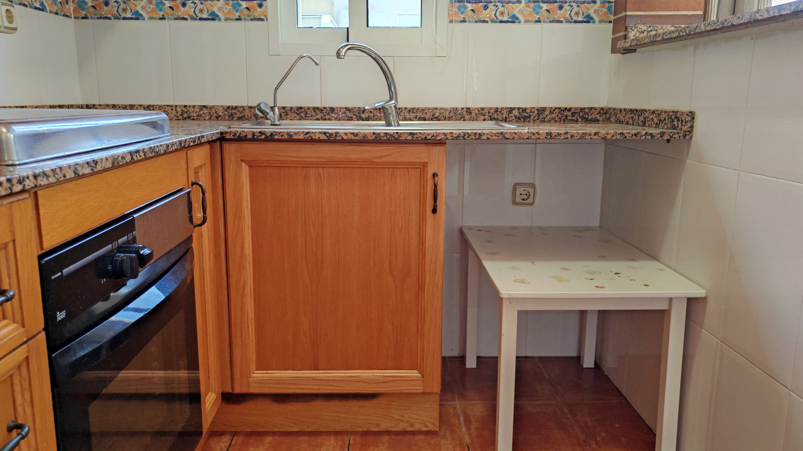 Ahora sí, vayamos a la vivienda. Al entrar, se accede al pasillo, donde a la izquierda se queda el salón, con un arco que se comunica con la cocina, pequeña pero suficiente para demostrar tus dotes culinarias.
